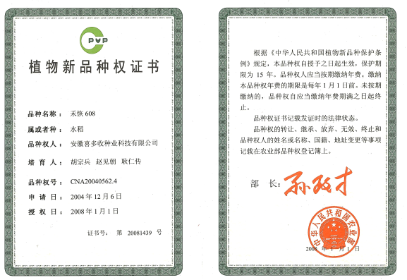 禾恢608植物新品種權(quán)證書